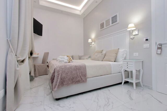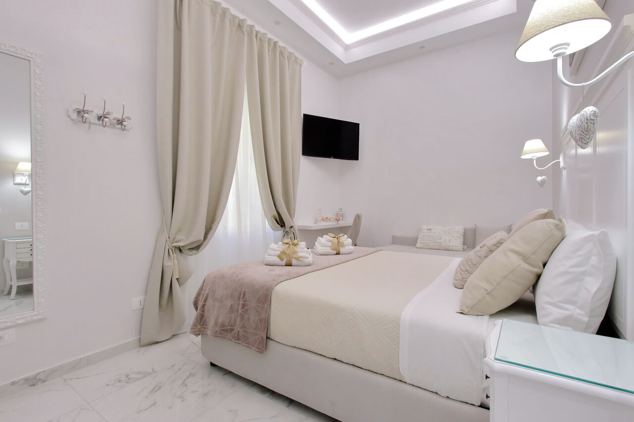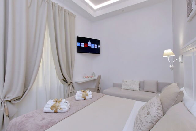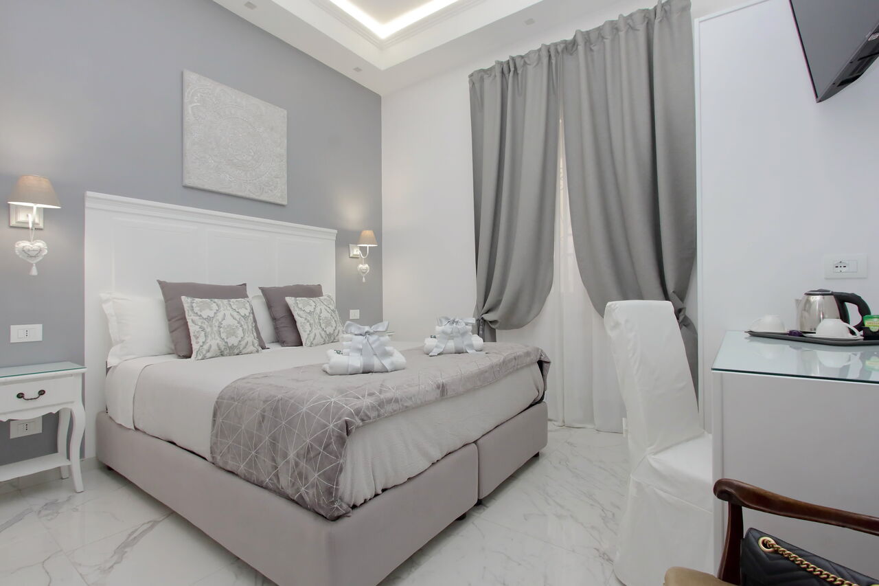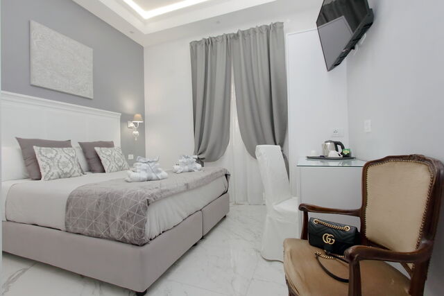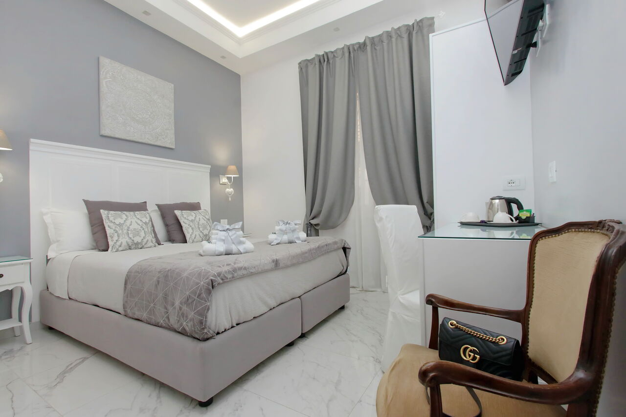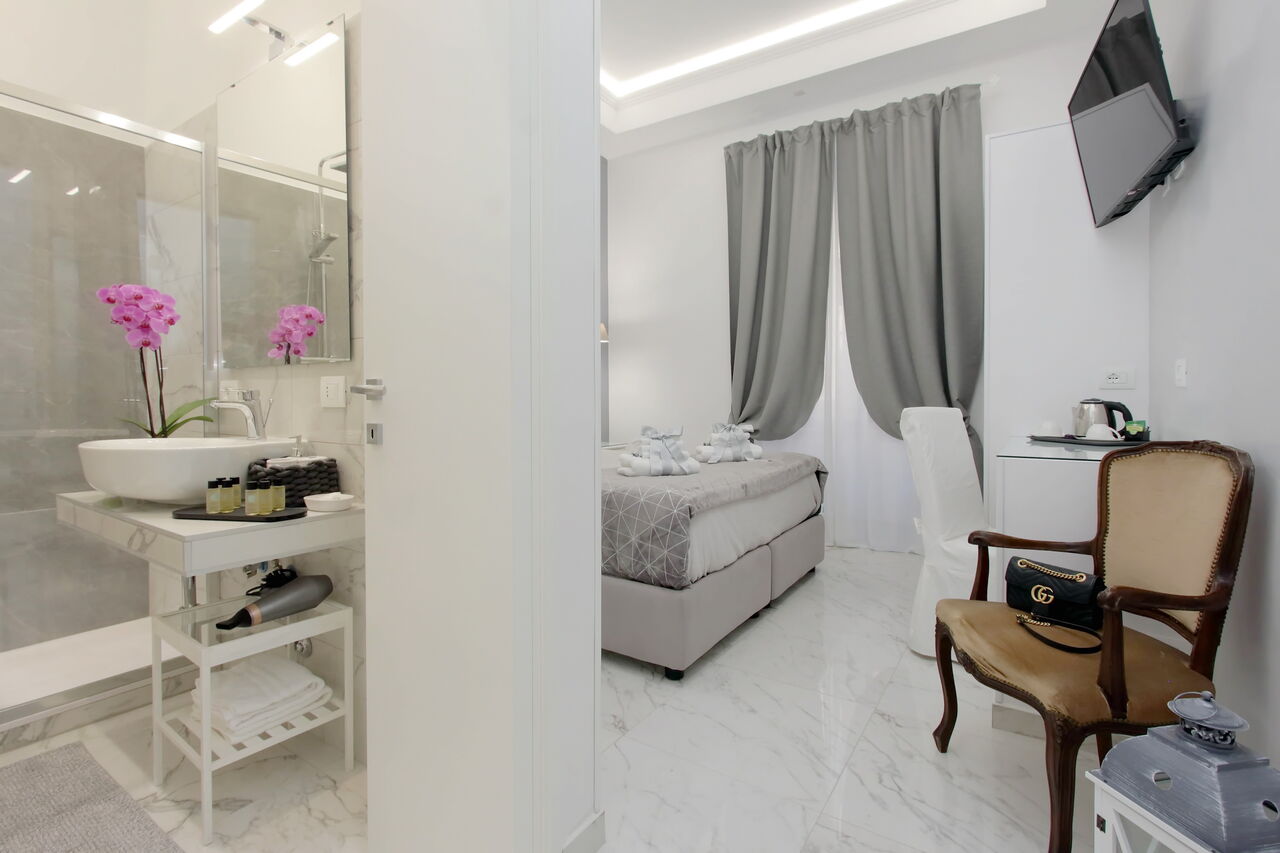 Camere luminose provvisti di aria condizionata, scrivania, bollitore, frigorifero, cassaforte, TV a schermo piatto, arredate con raffinata eleganza dotate tutte di bagno en suite privato con bidet e un raffinato contesto esterno.