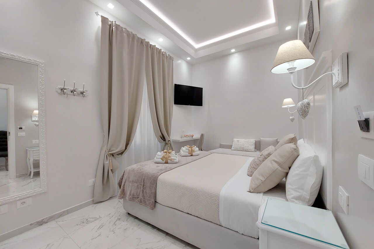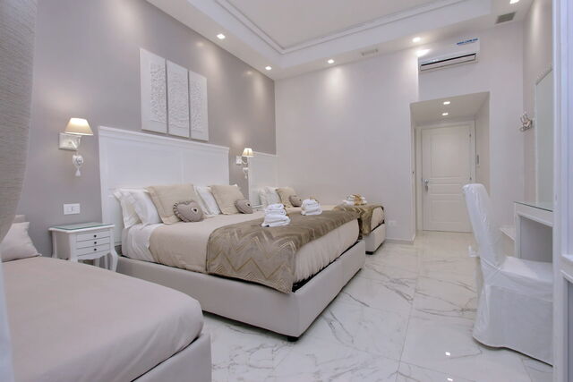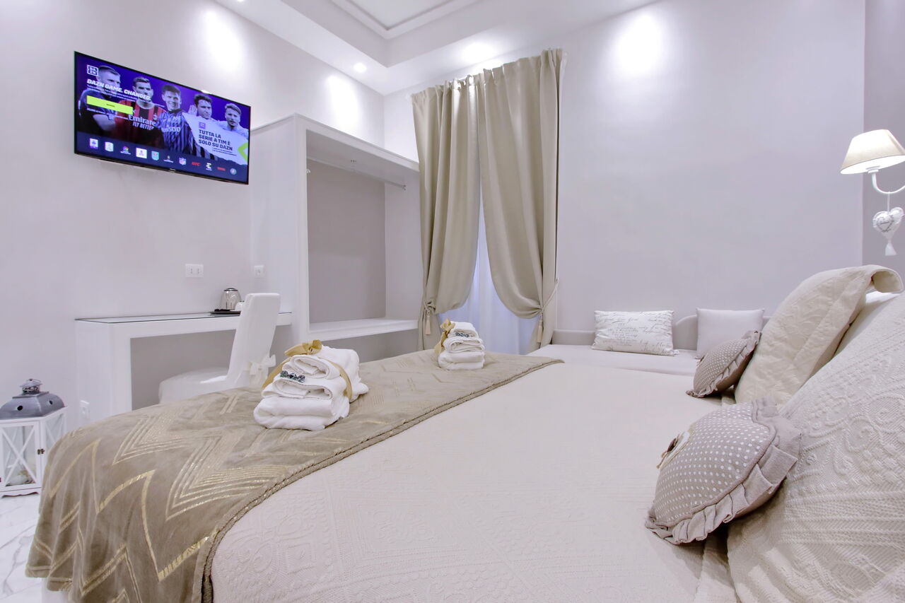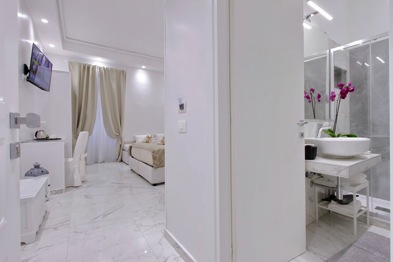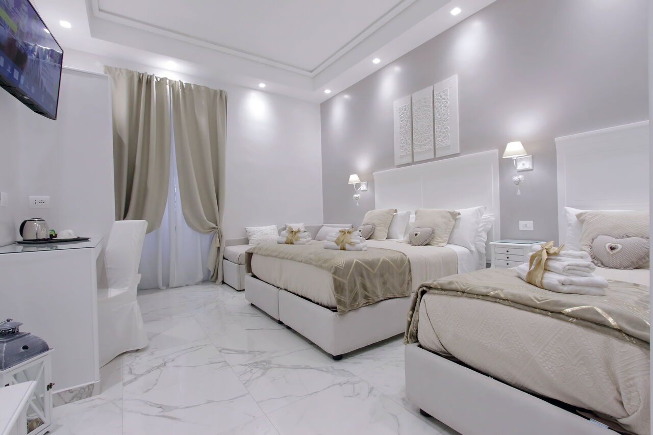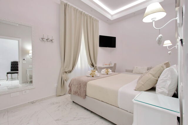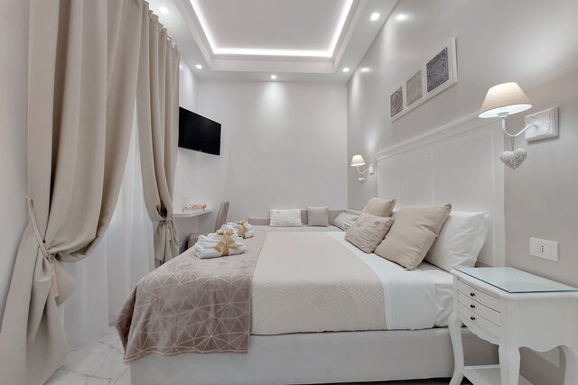 Camere luminose provvisti di aria condizionata, scrivania, bollitore, frigorifero, cassaforte, TV a schermo piatto, arredate con raffinata eleganza dotate tutte di bagno en suite privato con bidet e un raffinato contesto esterno.